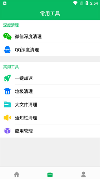 常用工具区域分为两类:一类是深度清理服务,覆盖微信与QQ产生的缓存、日志、临时文件等隐蔽垃圾;另一类为实用工具,涵盖一键加速、垃圾扫描、大文件定位、通知消息归类清理及安装应用管理,满足从表层到深层的全方位优化需求。
