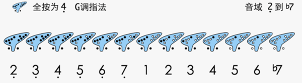 G调指法以除食指两小孔外全按为低音4,音域为低音2至中音6,因范围有限,较少使用。