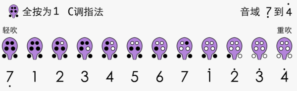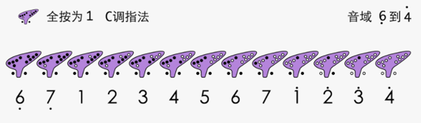 C调指法以除食指两小孔外全按为1,是十二孔陶笛最基础指法,音域从低音6延伸至高音4。