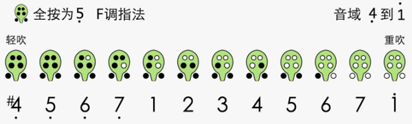 F调指法以除食指两小孔外全按为低音5,可覆盖低音3至高音1,适配多数流行曲目。