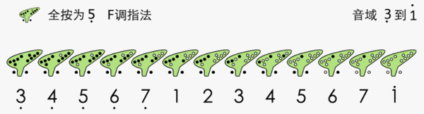 F调指法以全按为低音5,可演奏低音5至中音7,配合技巧可延伸至高音1,适用于大多数歌曲,C调陶笛使用此指法实际发出F调音高。