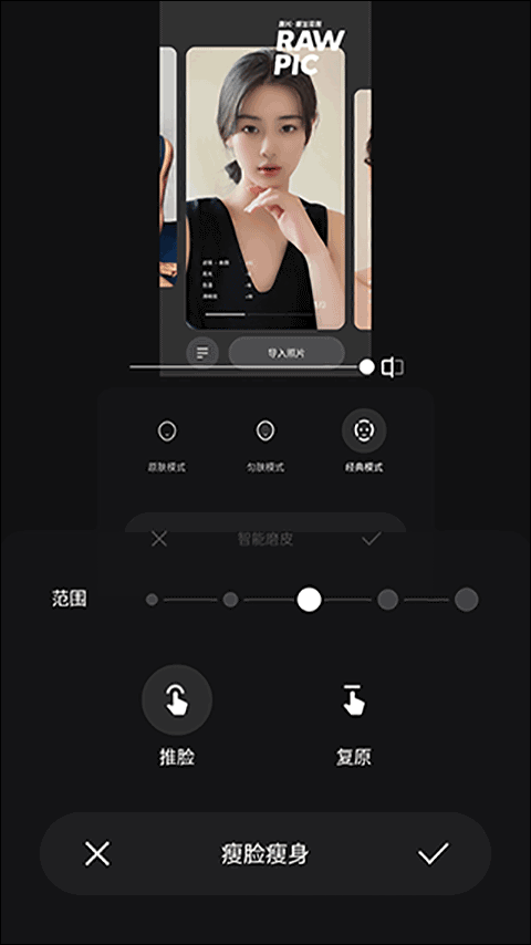 进入人像栏,可使用瘦脸、瘦身、面部重塑及美妆等精细化修饰工具。