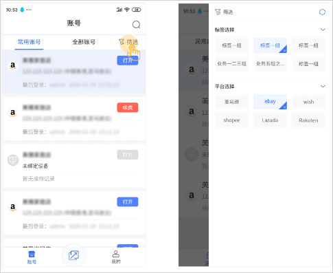 支持按平台类型或自定义标签筛选账号,提升管理效率。