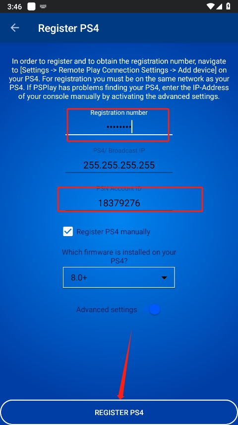 勾选“RegisterPS4manually”,随后输入对应的8位注册码及账户ID,点击“REGISTERPS4”完成绑定。