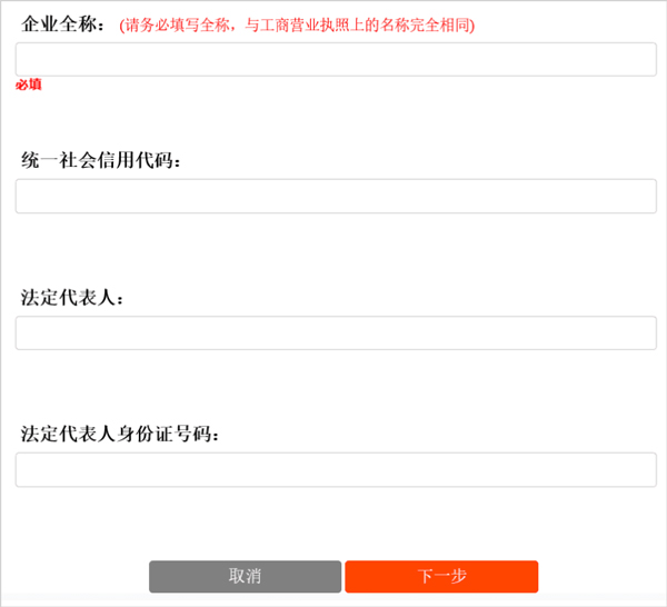 填写企业四要素信息,确认无误后点击【下一步】。