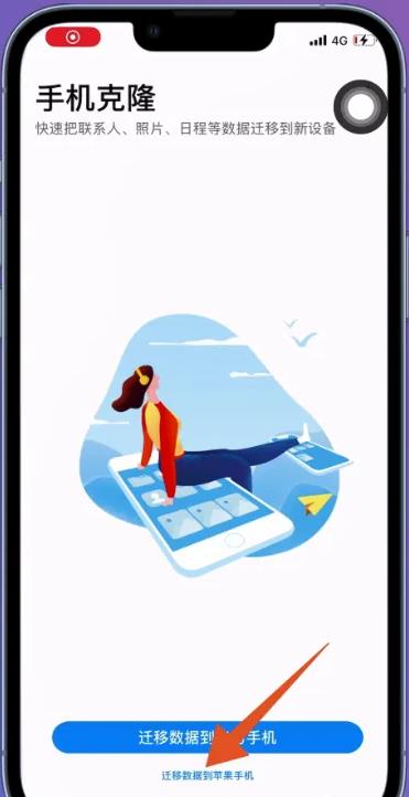 在iPhone上下载并打开华为手机克隆应用,点击底部“迁移数据到苹果手机”。