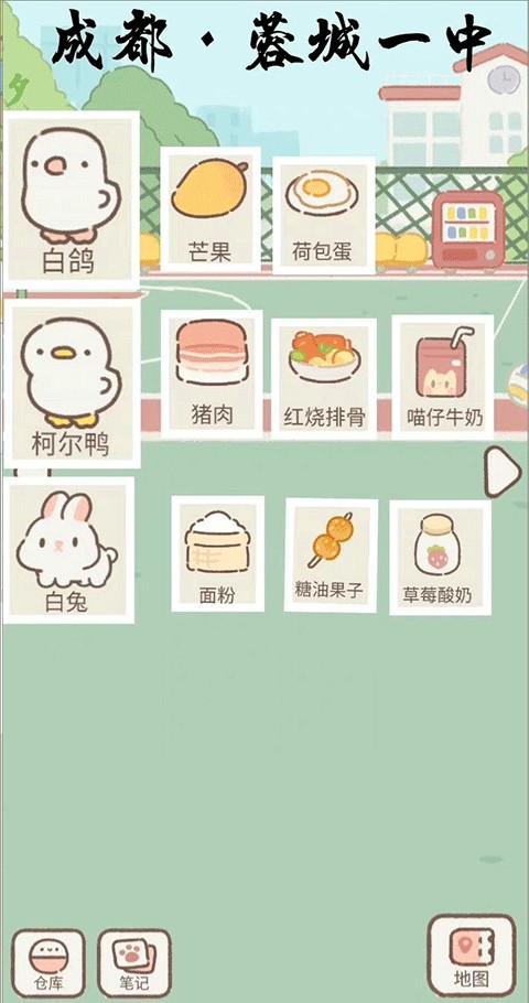 成都-蓉城一中 白鸽啄食芒果与荷包蛋;柯尔鸭细品猪肉、红烧排骨与喵仔牛奶;白兔就着面粉、糖油果子与草莓酸奶静静用餐。