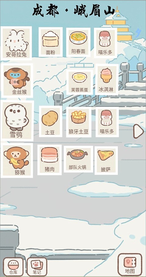 成都-峨眉山 安哥拉兔继续享用面粉、阳春面与喵乐多;金丝猴独爱芙蓉蒸蛋与冰淇淋;雪鸮啃着土豆、狼牙土豆与喵乐多;猕猴大快朵颐猪肉、部队火锅与披萨。