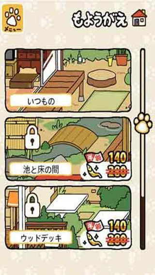 扩建后院需攒满180金鱼干,在商店末页找到房屋图标道具即可解锁。扩建后空间延展,地面纹理变化,连光影投射角度都随之微调。扩建不限次数,每次完成,菜单左下角都会浮现新的房屋标记,静待下一次积累。