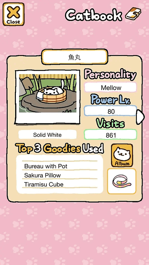 条目中的猫咪图鉴记录着每一次相遇。毛色描述细致到绒尖泛光的程度,相册入口紧挨着礼物栏,点开就能回看它第一次跃上秋千的模样。每只猫的喜好排行榜排在最下方,前三名道具旁还标着使用频率,像一份无声的偏好报告。