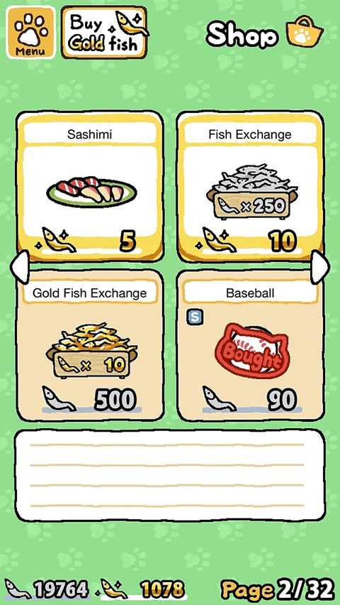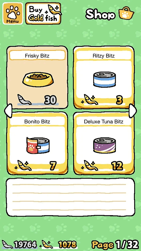 商店里用银鱼干买基础猫粮与玩具,金鱼干则解锁特殊猫粮与稀有道具。黄色食盆性价比高,适合初期积累;三文鱼猫粮气味更浓,容易引来穿戴服饰的特别访客。架子类道具价格较高,建议优先选最高层的普通猫爬架与带瓷器摆件的书架,既实用又耐看。