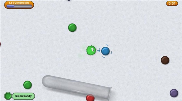 通过触控或键盘控制球体移动方向,持续接触目标食物即可完成吞噬