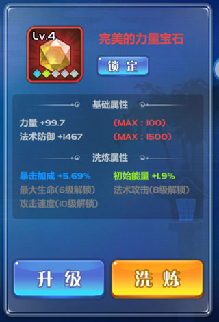 每颗宝石包含基础属性与洗练属性两类。基础属性在获得时即已固定,无法更改;洗练属性则由系统随机生成五条不重复的属性类型,随宝石等级提升逐步激活,并可通过消耗宝石晶粉进行数值重置。品质越高的宝石,洗练属性的上限也越高。