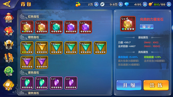 新增宝石分为力量、敏捷、智力三大类型,每类均设五种品质,依次为绿、蓝、紫、橙、红,品质越高,附加属性越强。