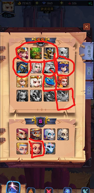 图中标红英雄均为前期推图核心,足以支撑初期关卡挑战。物理系推荐布鲁斯与罗杰。