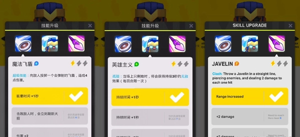 盾王一技能投掷盾牌造成伤害并眩晕,三级时伤害提升至3点;二技能在孤身一人时触发无敌,满级持续7秒;三技能沿直线投掷长矛,穿透敌人,最高造成6点伤害。