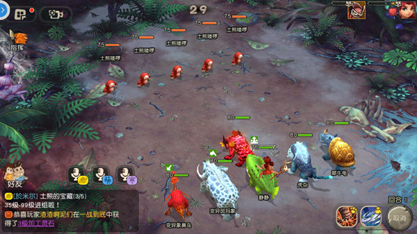 活动开始后,点击参与按钮即可传送至专属场景。场景内分布着三种土熊:土熊喽啰、土熊精英与土熊首领。土熊喽啰可单人挑战;土熊精英需至少3人组队;土熊首领则要求5人队伍方可发起挑战。