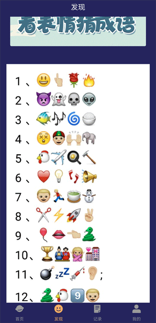 在发现界面中还能尝试看表情猜成语的趣味玩法。
