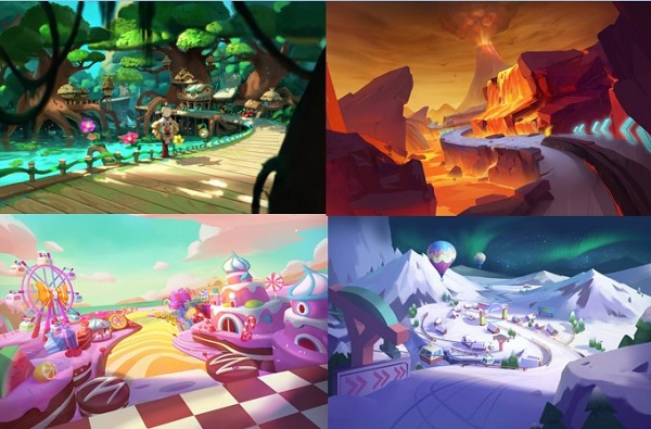 赛道场景风格多元,既有苍茫壮阔的沙漠赛道,也有银装素裹的高山雪场,还有弥漫甜蜜气息的糖果主题赛道,每一处都呈现出独特视觉魅力。