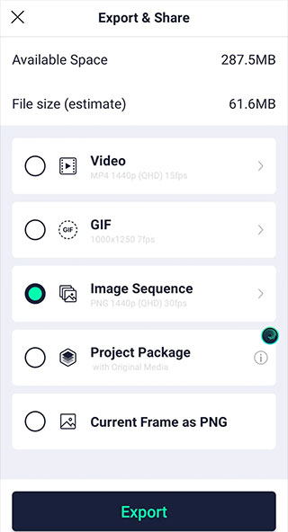 支持导出为视频、GIF或ImageSequence(图像序列包)。